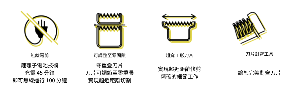 五星細節無線細修電剪配置的刀片可調節至零重疊, 實現超貼近修剪、勾勒輪廓和精確的細節修飾。